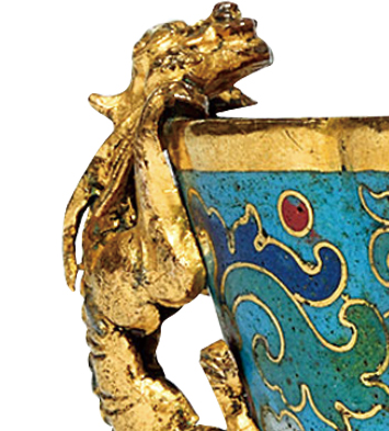 器身以珐琅釉为地,常见的颜色有蓝色、黄色等,色泽温润醇厚。外壁以掐丝技法制作花卉纹,花卉纹的种类丰富,可能有莲花、牡丹等,花朵饱满,花瓣层次分明,以掐丝代替笔锋双勾而成,线条细腻流畅,展现出工匠高超的技艺。花卉纹之间常以夔龙纹相间,夔龙纹线条简洁有力,富有古朴的美感。口沿、内壁、腹足交接处、足缘等部位通常会进行鎏金处理,使整个器物显得更加华丽大气,金色亮润,与珐琅釉的色彩相互映衬,相得益彰。圈足底心常錾刻方形双框楷书款,如 “大清乾隆年制” 等,字体规整有力。