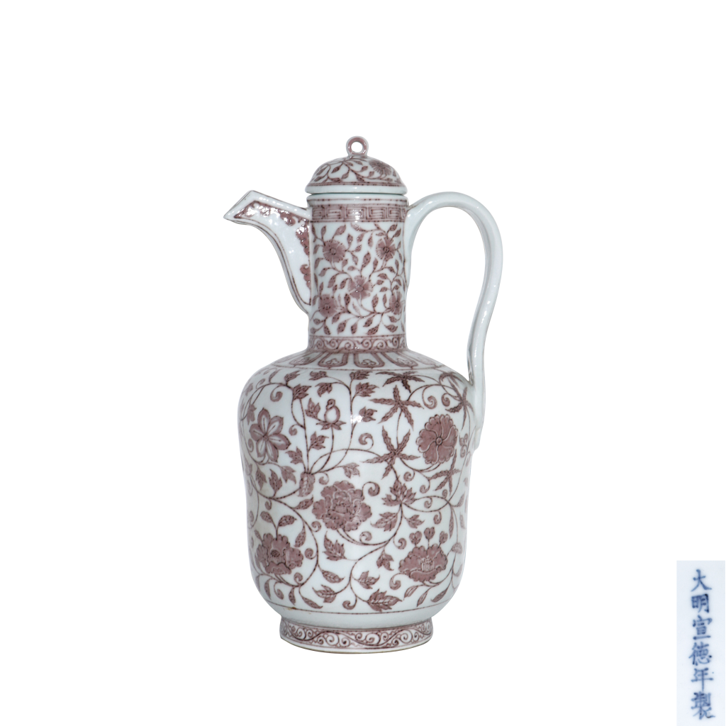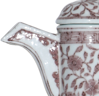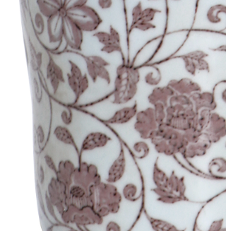 時代特點:明洪武時期的釉裏紅纏枝花卉紋花澆,紋飾以線描為主,風格古樸、厚重,器型碩大,紋飾豐滿,氣勢奪人,但發色多為紅中偏灰黑的色調。永樂、宣德時期的釉裏紅發色極佳,濃厚鮮豔似寶石,也有淡紅色的,此時的花澆在紋飾繪制上更加精細,布局漸趨疏朗。
