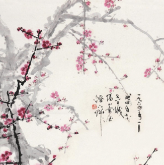 筆法上,以「書法入畫」—— 枝幹用「篆隸筆意」,線條遒勁有力,如「鐵線勾勒」;花朵用「點染結合」,先以淡墨打底,再用硃砂層層罩染,花瓣邊緣留白,呈現「濃淡相間、立體感強」的效果。色彩上,突破傳統「水墨為上」的觀念,大膽使用硃砂、胭脂等鮮豔色彩,卻通過墨色的調和避免「艷俗」,形成「濃而不烈、艷而不俗」的獨特韻味,盡顯嶺南畫派「色彩明快、筆墨靈動」的特色。