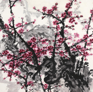 打破傳統「折枝梅」的局限,多採用「全景式構圖」—— 或繪整株紅梅立於山石之間,或描紅梅與蒼松、翠竹搭配,營造「主次分明、層次豐富」的空間感。例如《紅梅迎春》中,紅梅枝幹從畫面左下角斜向上伸展,枝頭花朵密布,背景以淡墨渲染遠山,既突出紅梅的主體地位,又展現「天地開闊」的意境,盡顯「大氣磅礴」的風格。