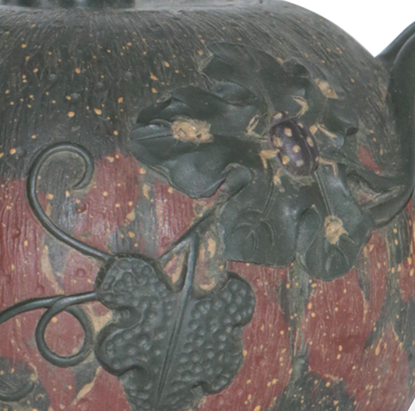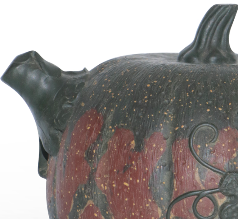 20 世紀 50-80 年代是蔣蓉創作的黃金期,這一時期的「紫砂南瓜壺」也隨着她的技藝成熟不斷升華:早期作品側重「形態還原」,如 50 年代創作的南瓜壺,壺身較為飽滿,瓜棱紋清晰但線條相對簡潔;中期作品強調「細節刻畫」,如 60 年代的南瓜壺,開始在瓜葉上添加絨毛感,瓜蒂的彎曲弧度更趨自然;晚年作品則更重「意境營造」,如 80 年代的南瓜壺,常搭配小螞蟻、小瓢蟲等微雕,讓整把壺充滿「田園生機」,仿佛南瓜在田間生長時的真實場景。
