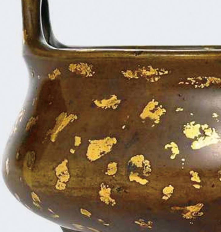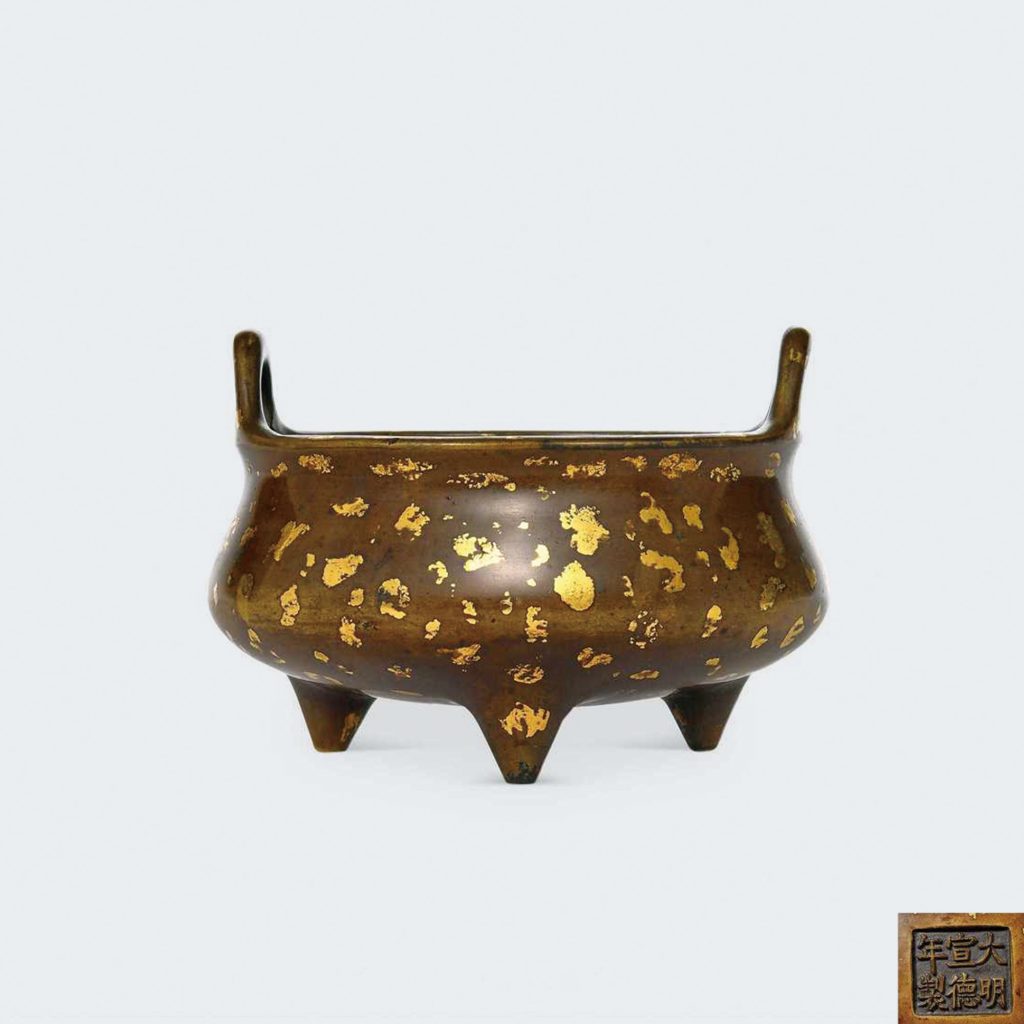 澳門多祿溙國際拍賣中,這件明崇禎銅灑金冲耳三足爐,因「年代久遠、工藝經典」,雖爐口有輕微磨損(不影響整體品相),仍以人民幣 6325 萬元成交。作品的銅質呈栗殼色,包漿自然,金屑在包漿下隱現,冲耳線條流暢,三足與爐腹連接無痕,底足有「宣德年製」仿款(崇禎年間常仿宣德爐),是明代晚期銅爐的「代表作」,也是研究明代文人用爐的「重要實物資料」。