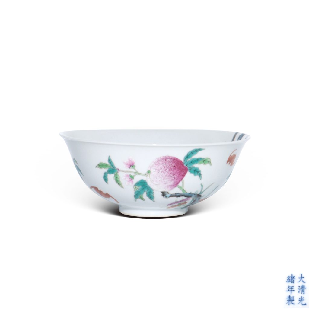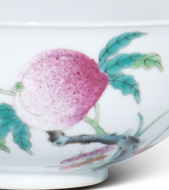 它是「福寿文化的瓷質載體」。過枝紋向來是清代官窑的「經典創新紋飾」—— 紋樣從碗外壁延伸至內壁,如枝條跨過碗口「過牆而來」,打破器型邊界,营造「渾然一體、生機盎然」的意境;而九桃紋是皇室專屬的吉祥符號,桃象征「長壽安康」,九為「天數之極」,九桃組合寓意「九五之尊、福寿綿延」,是明清帝王對「長壽久安、皇室興旺」的核心祈願。粉彩工藝則讓這份寓意更添華彩 —— 以「玻璃白」打底,再施粉紅、嫩黃、碧綠等釉色,色彩柔和粉嫩如春日桃園,既還原桃子的飽滿多汁,又透出皇家的典雅貴氣。