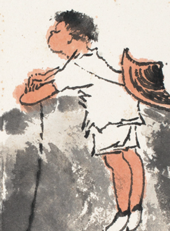 李可染的《牧牛圖》多以水墨為主,僅在關鍵處點染少量色彩,起到「畫龍點睛」的作用 —— 牧童的衣袍多為紅色(硃砂)或黃色(藤黃),在滿幅墨色中格外醒目,既突出牧童的童真,又打破墨色的沉靜;背景的花草偶爾以淡綠(花青調藤黃)點染,與墨色形成「冷暖對比」,營造田園的生機。這種「以墨為主、以色為輔」的色彩觀,既繼承了文人畫「水墨為上」的傳統,又融入現代審美的「色彩張力」,形成獨特的藝術風格。