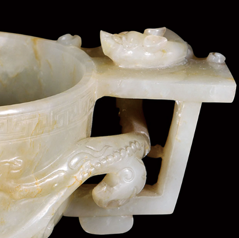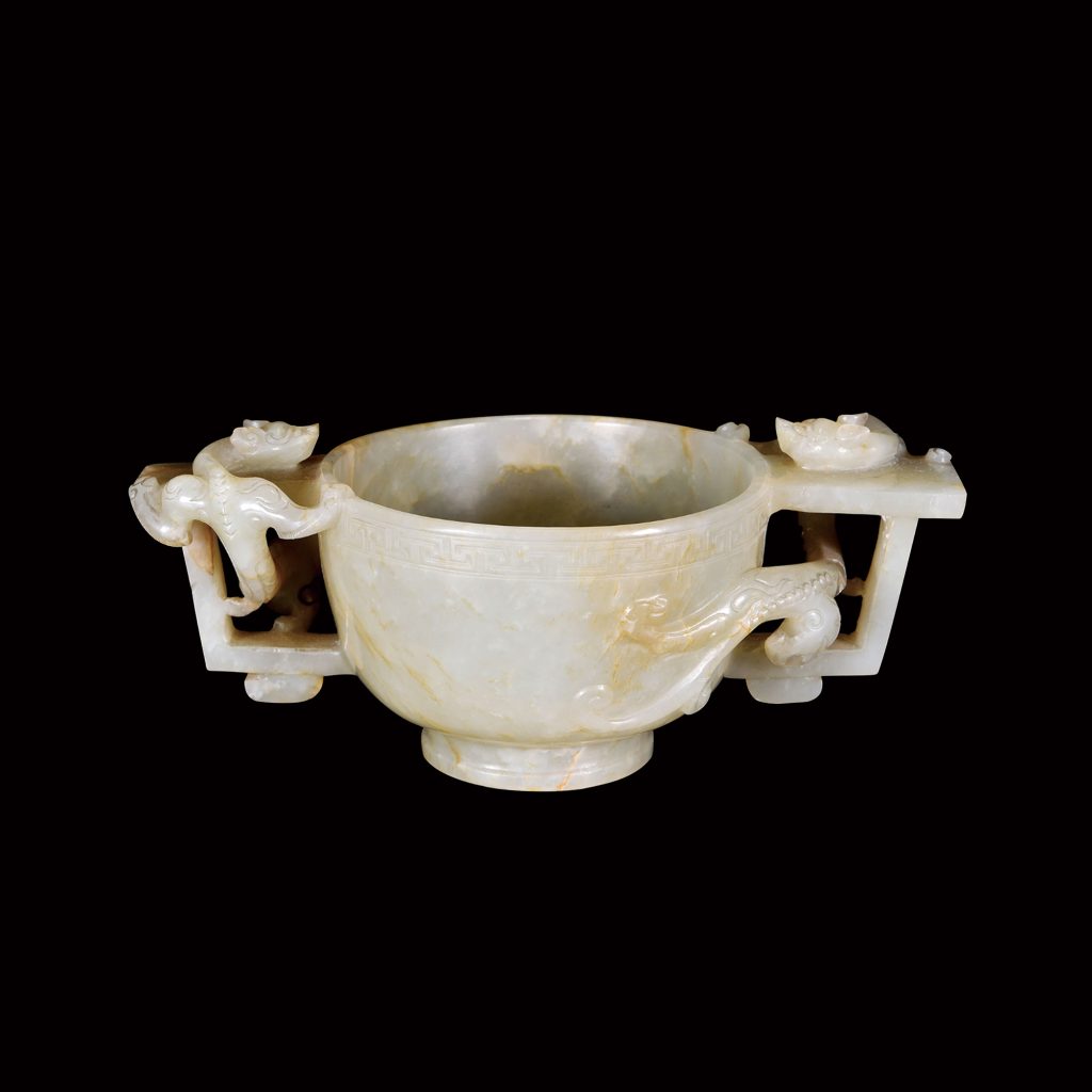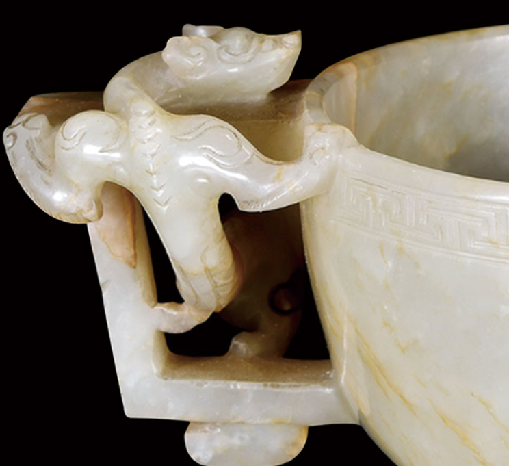 深入探究这杯子的精妙之处,会发现它在 “刚与柔”“简与繁” 的平衡把握上,堪称鬼斧神工。青白玉本质坚硬,可经能工巧匠之手反复打磨后,杯身流转着一层朦胧而迷人的柔光,捧在掌心,竟好似握住了一团软乎乎、糯叽叽的云朵,那奇妙的错觉,让人沉醉。再看杯耳上的螭龙,作为象征着无上权威的瑞兽,在匠人的精雕细琢下,线条变得无比流畅顺滑。龙首微微抬起,龙躯蜿蜒缠绕于杯侧,周身不见丝毫肃杀凶气,反倒像是与杯身缔结了深厚情谊,亲昵地依偎在一起。此时,脑海中不禁会浮现出这样的疑问:当年那位神秘的匠人,是出于怎样的奇思妙想,特意让螭龙展现出这般柔和姿态?又或者,是那玉料本身独特的天然纹理,在冥冥之中引导着匠人,赋予了这螭龙别样的温顺模样?这其中的奥秘,如同被岁月尘封的宝藏,等待着有心人去一一探寻。