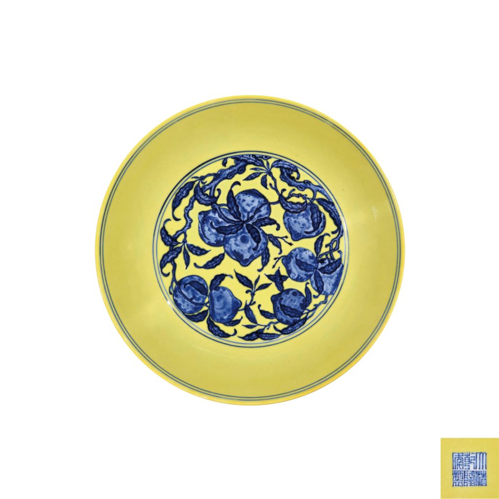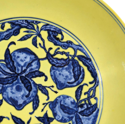 2019 年香港蘇富比秋拍中,一件清雍正黃地青花九桃紋盤(直徑 28.8cm,品相完美,帶原盒),從起拍價 800 萬港元開始,經過 50 多輪競價,最終以 3200 萬港元成交,刷新了同類盤子的拍賣紀錄