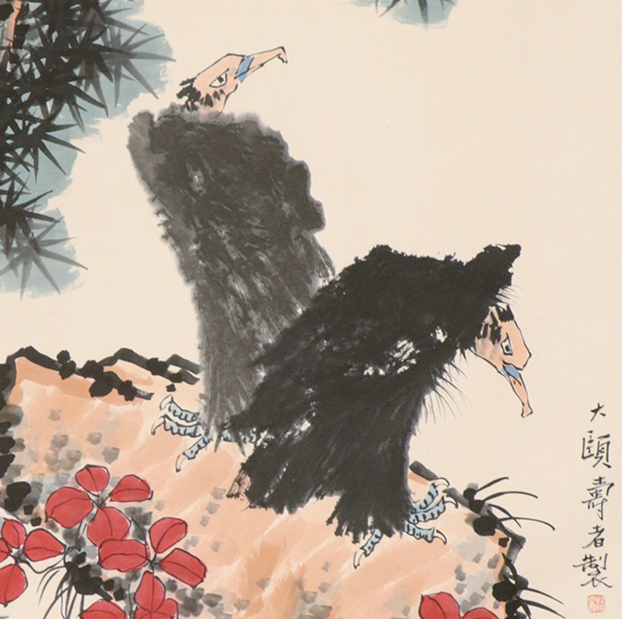先看這畫作的「構圖殺手鐧」。50cm×40.5cm 的畫布被潘天寿經營得「險中求穩」:他故意將重心壓在畫面中下部,用一塊渾圓厚重的巨石撐起畫面,石頭邊緣用枯筆勾勒,筆觸如鐵錘鑿石,粗獷中藏著細緻 —— 石面的皴紋有深有淺,深處用焦墨堆疊,淺處用淡墨暈染,連陽光照射下的陰影都用墨色輕重表現得淋漓盡致。兩隻禽鳥僅佔畫面 1/5 大小,卻是「畫眼所在」:一隻低頭梳理羽毛,鳥喙的尖銳、羽毛的層次用指墨點簇而成,黑乎乎一堆卻神態畢現;另一隻側身凝視,眼珠用濃墨點出,雖僅 0.3cm 大小,卻透出「凛然不可侵犯之銳氣」。最妙的是「虛實之戲」:巨石用實筆飽墨,背景則全無雜質,留白處仿佛藏著風聲雲影,讓小小的畫布生出「咫尺千里」的空間感,這正是潘天寿「山水與花鳥相結合」的獨創圖式。
