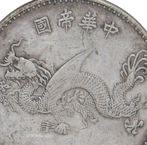 先看這銀幣的「雕刻殺手鐧」。3.9cm 的銀幣版面被意大利雕刻師 L.Giorgi 經營得「帝王氣十足」:正面的袁世凱身着陸軍上將戎裝,頭戴高耸的鹭羽冠(俗稱「冲天冠」),冠上羽毛層次用浮雕技法刻出,每根羽絲僅 0.1cm 粗,卻根根分明;臉部輪廓飽滿,鬍鬚的捲曲弧度、眼角的皺紋都清晰可辨,最驚艷的是胸前的大勳章,鏤空花紋細如髮絲,在光线下能映出細微光影。銀幣右侧緣還藏着「L.GIORGI」的斜体花体签名,字長僅 0.8cm,筆劃流暢如行書,這是「签字版」的標誌。背面更是「中西合璧的傑作」:一條双翼飛龍展開翅膀,龍身盤旋如環,一爪持標、一爪握箭,既有西方神話中飛龍的威猛,龍鱗的排列又遵循中國傳統「九爪為尊」的規制;龍頭上方環刻「中华帝国」四字,下方鐫「洪宪纪元」,字體方勁有力,每個字約 0.5cm 見方,筆劃深淺一致,可見當時天津造币厂的鑄幣工藝已達巔峰。