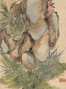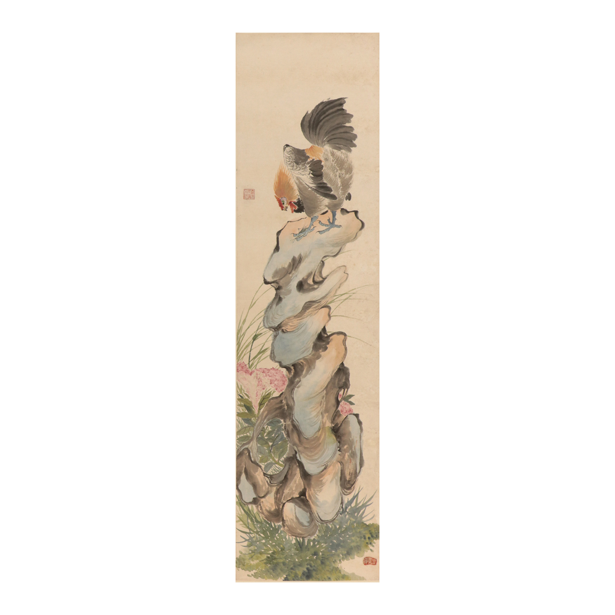 96×35cm 的宣紙被朱偁打造成「筆墨吉祥場」。作為海派畫壇「花鳥聖手」,他在這件立軸中將物象比例拿捏得極為精妙:畫面中雄雞高約 28cm,佔據豎向尺幅的近三分之一,紅冠如火焰躍動,僅用 3cm 直徑的硃砂點染,卻顯得威風凜凜;旁側三株鸡冠花高約 22cm,花瓣層疊間用淡墨暈染出陰影,與雄雞的濃墨勾勒形成輕重對比。最絕的是「留白藝術」:畫面下方 15cm 的空白處僅繪幾片落葉,既平衡了構圖,又暗合「鴻運當頭」的寓意。而朱偁擅長的扇面小品尺寸更精巧,如 15.4×50cm 的扇面中,雄雞僅高 8cm,卻能以細線勾勒出羽毛的層次感,可見其「小尺幅見大乾坤」的功力。