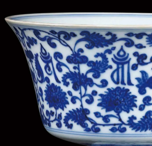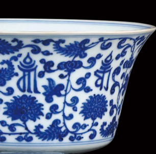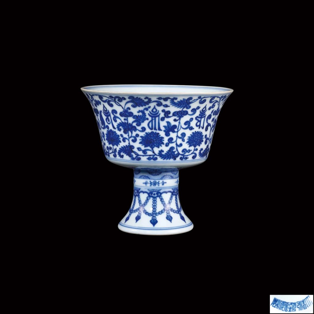 在拍场上,青花缠枝莲梵文高足杯向来是 “宗教青花的硬通货”,尤其是明宣德本朝与清三代官造精品,成交价悬殊巨大。