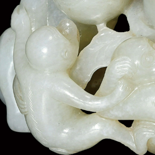 2019 年佳士得線上拍中,清十八世紀白玉靈猴獻桃把件(約 5×4×3cm),以4,000 英鎊(約合 3.6 萬元人民幣)成交,可見老件尺寸越小價差越明顯。