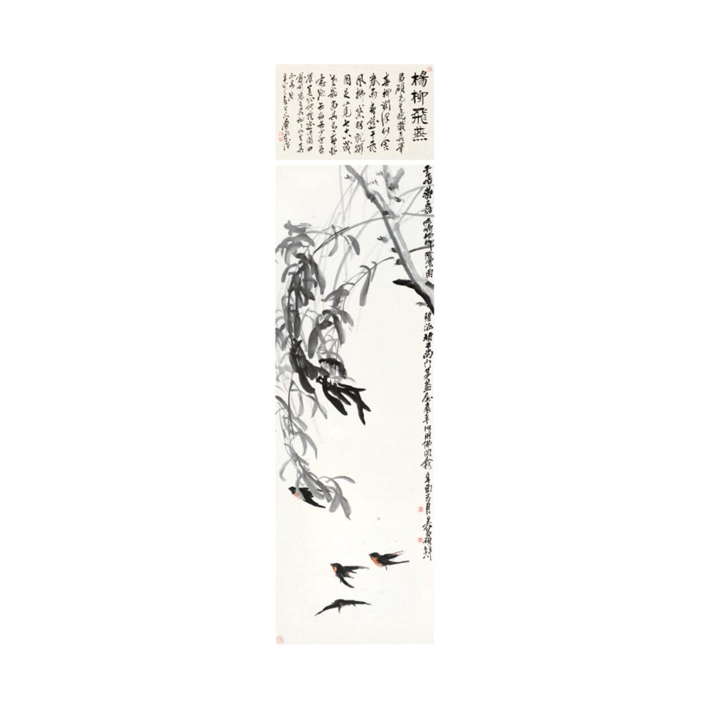 不同尺寸的《楊柳飛燕》,被吳昌碩打造成 “文人審美的分級舞台”。以 2024 年保利秋拍拍出 1897 萬的清光緒三十四年吳昌碩《楊柳飛燕圖》立軸為例,通縱 130cm,橫 66cm,整體呈 “豎長構圖”—— 上留天頭 15cm,下留地腳 10cm,恰好凸顯楊柳 “自上而下” 的垂墜姿態。最絕的是 “尺寸與筆法的黃金配比”:130cm 的高度讓楊柳枝條可從畫面頂端延伸至中部,以篆書筆法勾勒的枝幹粗細從 1cm 漸變至 0.2cm,筆力沉穩卻不失飄逸;66cm 的橫寬容納三隻飛燕呈 “品” 字形飛翔,每隻飛燕翅展 4cm,與柳枝間距 8cm,恰好形成 “動靜相濟” 的視覺效果。相比之下,扇面小品更顯精巧:2021 年佳士得拍出的《柳燕圖》扇面,縱 22cm,橫 58cm,楊柳枝條縮短至 30cm,卻以 “濃墨點喙、淡墨畫翅” 技法,讓飛燕在弧形扇面上更顯靈動,每筆線條長度不超 5cm 卻力透紙背。
