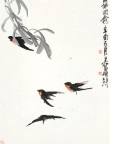 2024 年澳門多祿溙國際拍賣中,清光緒三十四年吳昌碩《楊柳飛燕圖》立軸(縱 130cm,橫 66cm,帶 “苦鐵” 款),從 1200 萬起拍,最終以38,970,000 元人民幣成交,創該題材近十年紀錄