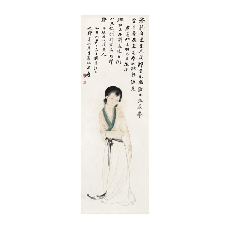2020 年北京保利秋拍中,1945 年作〈纨扇仕女〉立軸(縱 113.5cm,橫 51cm,紙本設色,王氏家族舊藏),以8,970,000 元人民幣落槌,印證中尺幅經典題材的收藏價值
